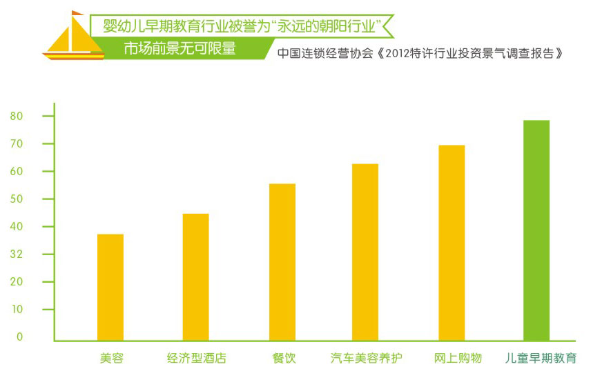 据《2014中国早教市场分析报告》显示,中国早教市场在2013年就达到2130亿人民币,专家估计未来每年还会以7%-8%的速度递增。我们观察到:今年来中国早教行业的发展趋势逐渐由一线城市迅速蔓延到二三线城市;早教行业还吸引了投资机构的注意,大量资金涌入推动行业蓬勃发展。业内人事及投资机构通过对市场规模和未来发展潜力的研判,认定早教师“永远的朝阳产业”,具体原因入上图